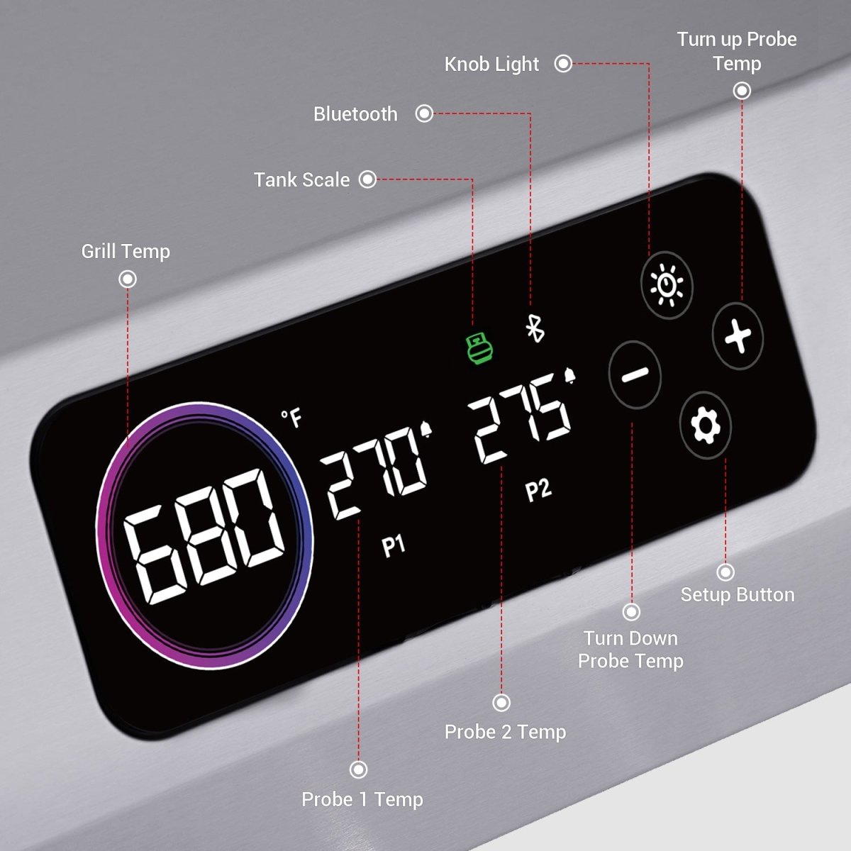 3rd-generation display shows temperature, timer, lighting modes, battery level, and gas tank capacity—visible even in daylight. -