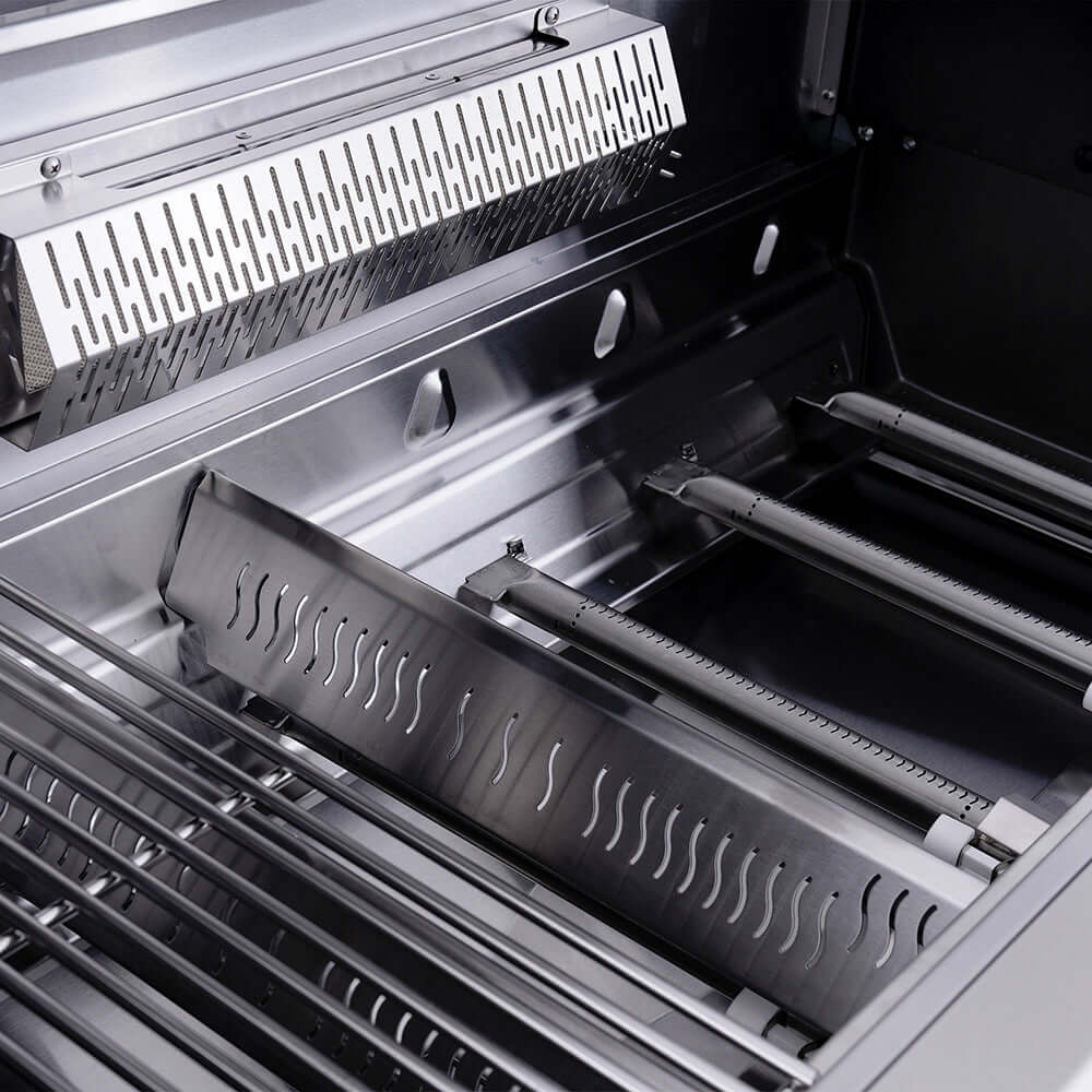 6 Blaze-Zone® burners, 1 rear ceramic infrared burner, and 1 side searing station delivering 89,000 BTUs. -
